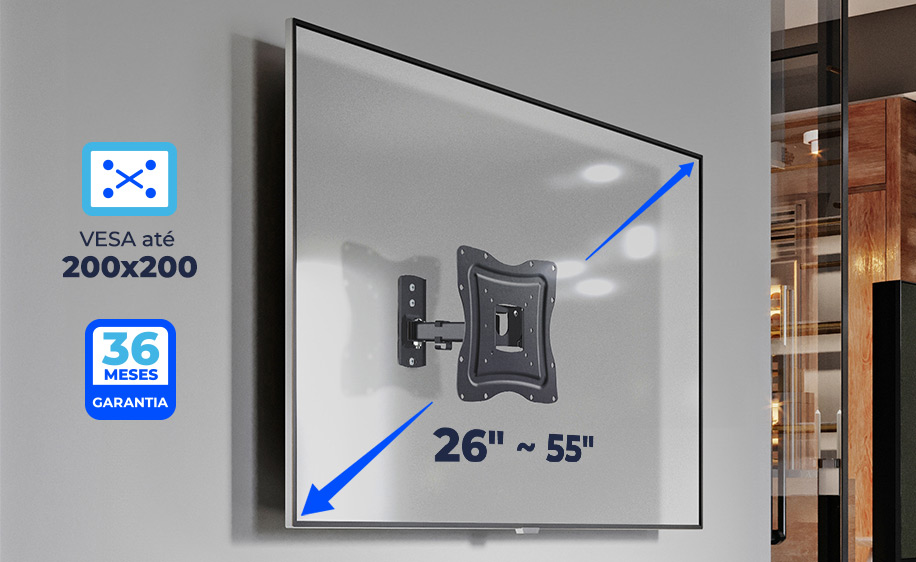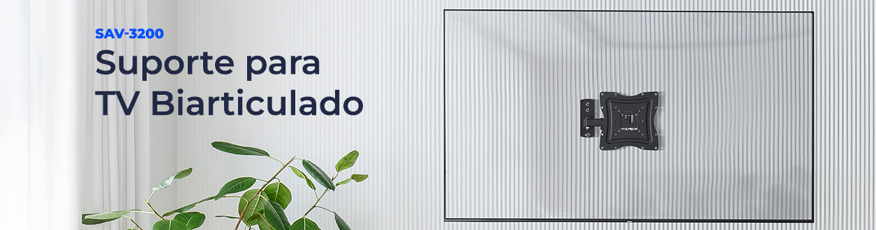 O Suporte Biarticulado Aquário SAV-3200 é ideal para televisores de 15” a 55”, oferecendo movimentos de inclinação, rotação e afastamento da parede.